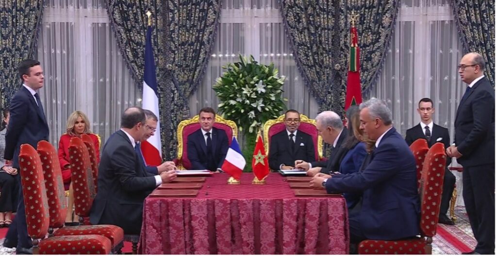 SM EL REY MOHAMMED VI Y EL PRESIDENTE EMMANUEL MACRON PRESIDEN LA CEREMONIA DE FIRMA DE VARIOS ACUERDOS ENTRE EL REINO DE MARRUECOS Y LA REPÚBLICA FRANCESA